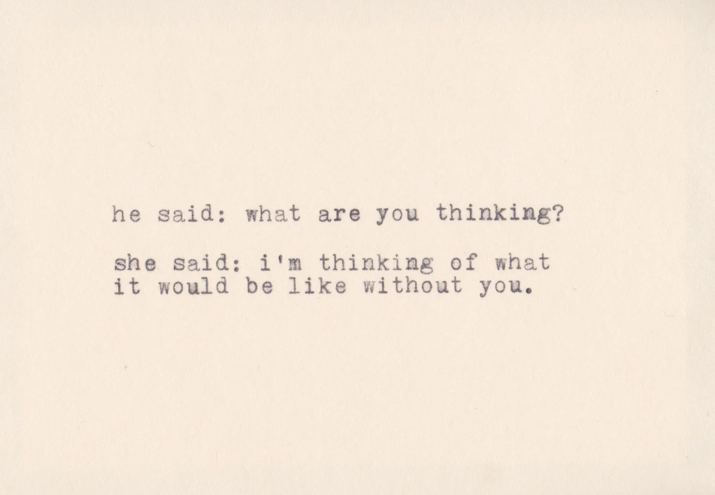 I consider these to be short stories in conversation, where the whole narrative is more than the sum of its individual exchanges. It intrigues me how much can be conveyed in so few words. If read together, the cards can seem to weave a story, but in reality the conversations took place over many years and with many different people. It is very personal work but, I believe, also speaks to the more universal narrative of the experience of being together, living, loving, and caring for one another. One of the things I love also about this is that it can be infinitely repeated, which I think speaks to that idea of universality also.