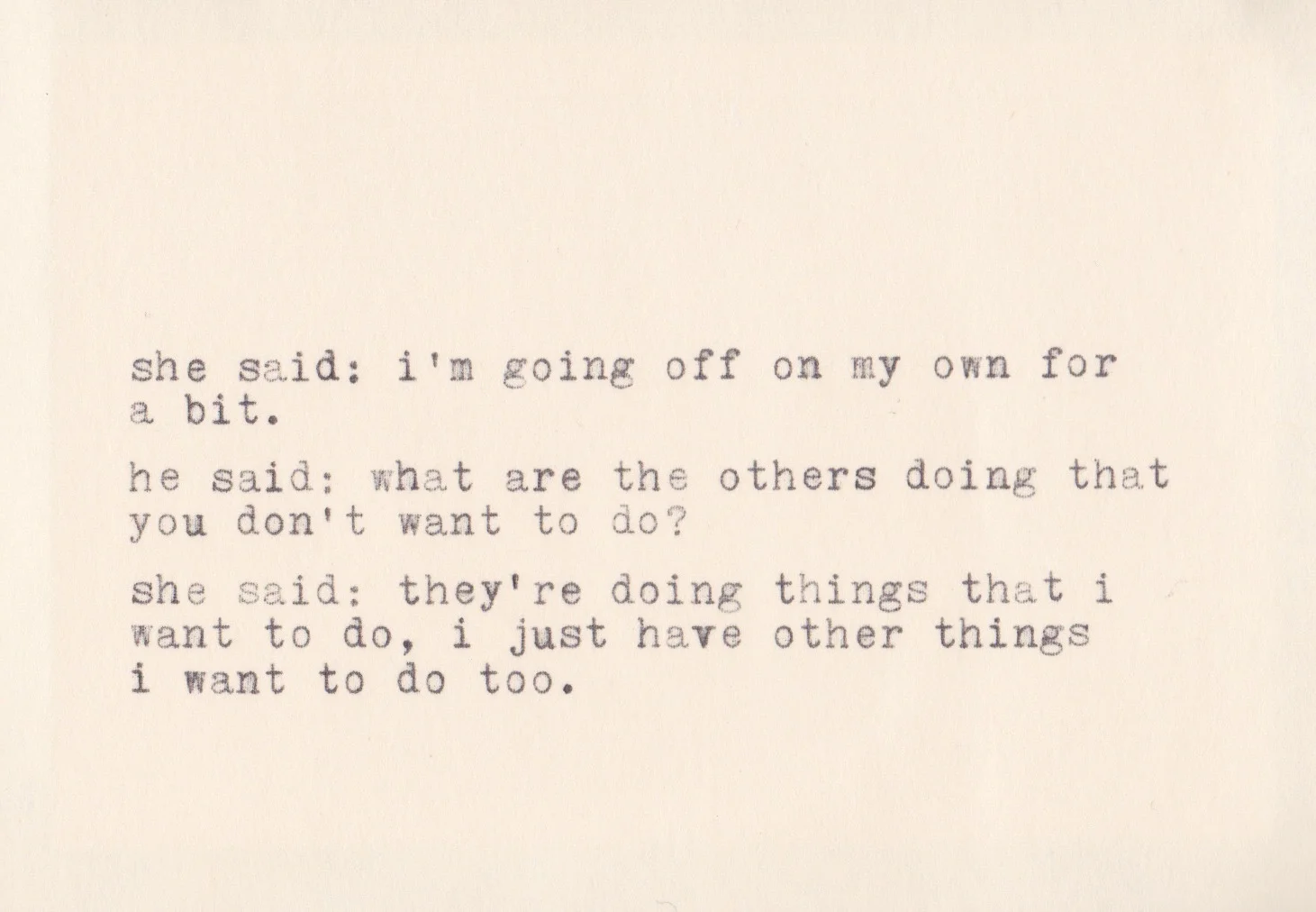 ak: I had spent a lot of time since I began picture-making creating photographs that metaphorically represented subjects that were not physically or visually present. I used words - phrases, statements, stories - as a process of creating photographs. Then I began orchestrating less and less, and thinking about text as a vessel far more appropriate than a photograph. I found that I could satisfactorily relay my the same sentiment of the photographs by using ‘the thing itself,’ the actual exchange between people. The dialogues are real, as my memory recalls (though many I found written in old notebooks), dating back to 2007. I showed the first instance of the work in 2011.