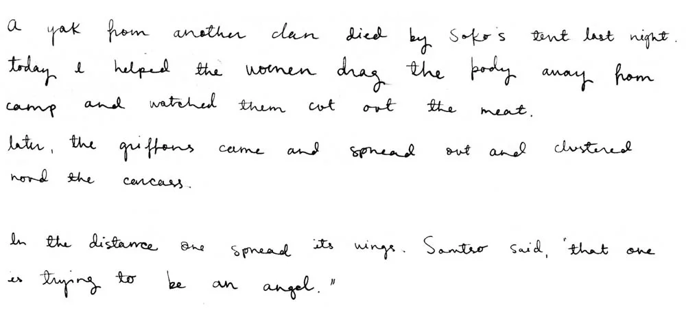 KG: I think the place and my time there provided the solution for me. Living in the grasslands, out that far in the elements, can leave you feeling raw and vulnerable if you are not raised in it. On my first day in Dashika an ill yak wandered into the compound of tents and died there. The men were all away on a trek and so I helped the women drag the corpse away. That same trip, lightening struck a tent a few miles away, killing an elderly woman and some of the yak herd. Out of the context of the time and place these things sound dramatic, even to me, but in the middle of it I just took it in. I noticed, slowly, that I had become comfortable seeing animals that had died from starvation or disease when I would go on walks around the mountains and hills, but the sudden death of the monk really shook me. It was then that I realized the place had moved so deeply into my being that my vulnerability must become part of the work.
