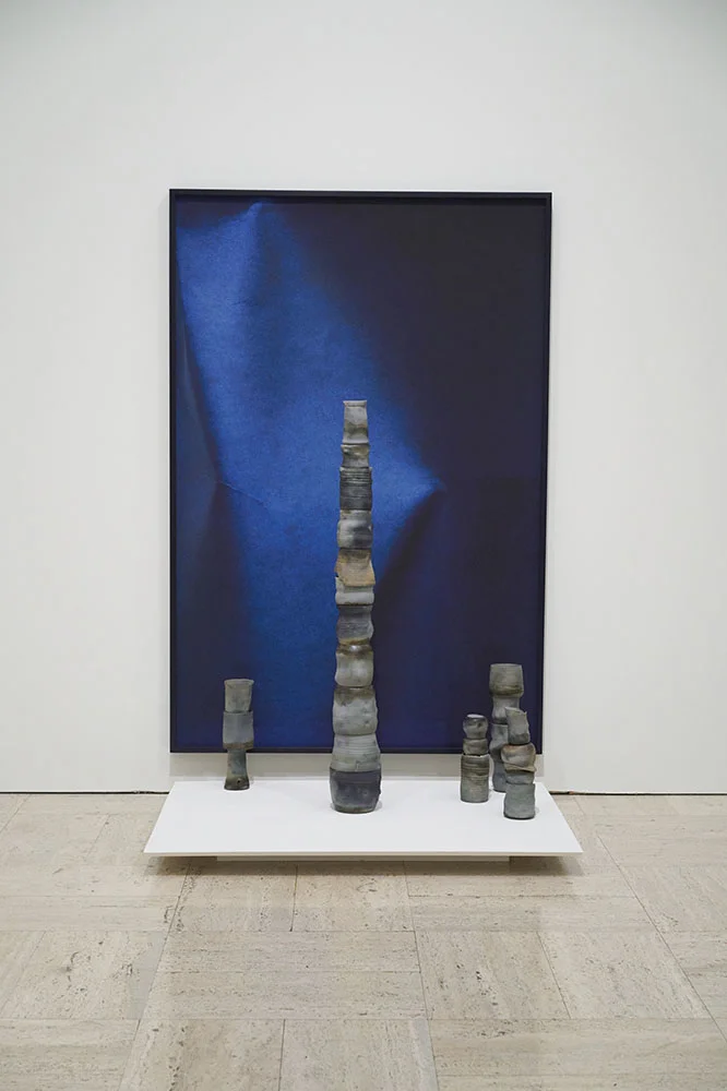 RS: Your new work features large-scale photographs paired with fragile, totem-like stacks of ceramic vessels. These seem precarious and gallery staff are instructed to leave the scene as-is if the formation collapses and breaks. There are so many references here that are consistent with the poetics of your earlier work—questions of the body, of fragility and vulnerability, of loss. To that tension and impending uncertainty of collapse you then add the photograph, which is fixed in place and essentially a large swatch of blue, like an ocean, bringing a sense of symmetry and stability. There's even a contrast between the rectilinear tears and folds in the print and the organic clay forms, much like life and time are a backdrop for our own flawed, fragile bodies. Do any of these readings align with what you were thinking in making this work?